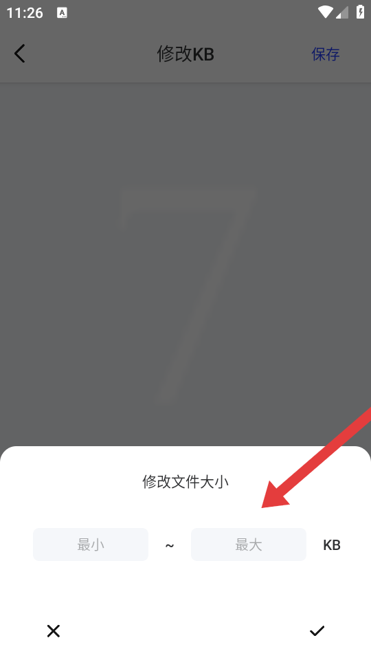 4、在大小设置弹窗中,输入KB数值范围后,点击右下角确认,完成像素大小修改。