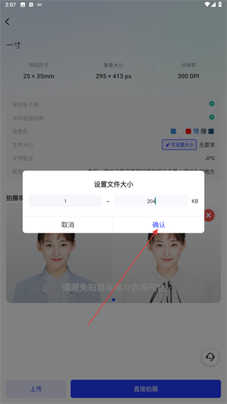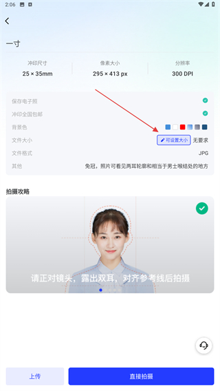 2、进入一寸拍照的页面内,点击设置文件大小的按钮。