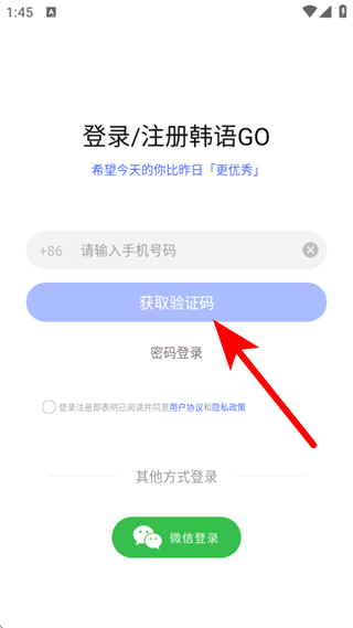 2、在登录/注册页面,输入手机号码,点击获取验证码。
