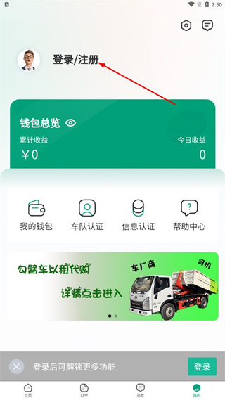 2、在我的页面,点击登录/注册,进入登录选择页面。