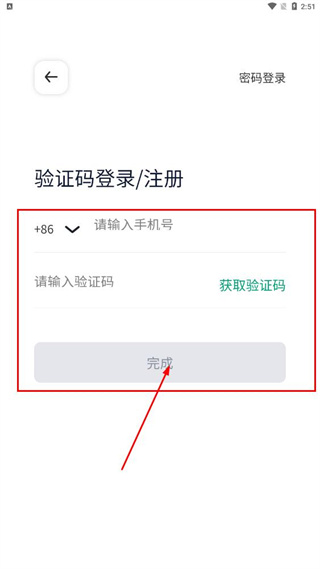 4、输入手机号码,获取验证码并输入,然后点击完成,完成登录操作。