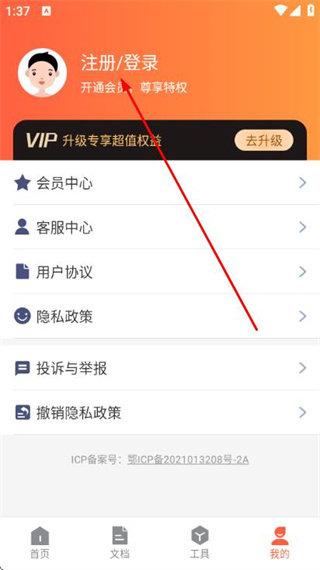 2、在个人页面点击注册登录,进入登录页面。
