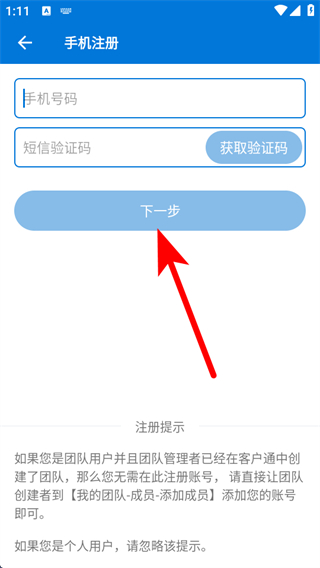 2、在手机注册页面,输入手机号码和短信验证码,点击下一步。