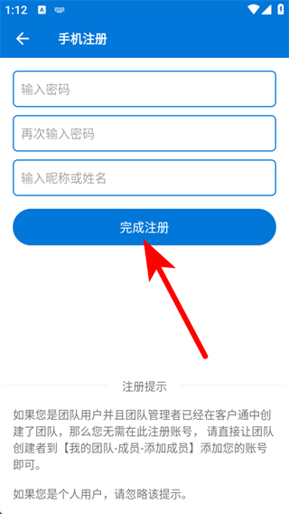 3、设置密码,输入昵称或姓名,点击完成注册,即可完成账号注册操作。