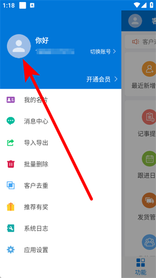 1、进入客户通APP主界面,点击左上角头像,展开个人功能菜单。