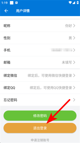3、在用户的详情页,我们需要点击退出登录的按钮。