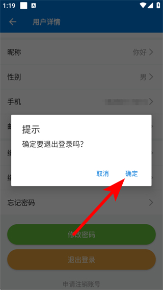 4、在弹出的提示框中,点击确定,完成退出登录操作。