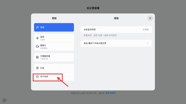 1、打开飞书会议室部署界面,点击左下角设置图标,进入设置页面。