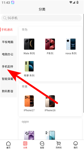 2、在商品分类界面,选择目标分类如手机配件,进入该分类下的商品列表页面。