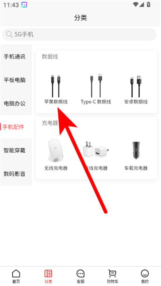3、在商品列表页面,选择具体的商品类型如苹果数据线,进入商品详情选择流程。