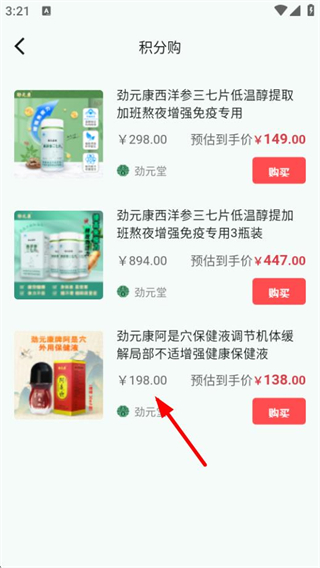 1、在劲元堂首页,点击积分购区域的箭头,进入积分购商品列表页面。