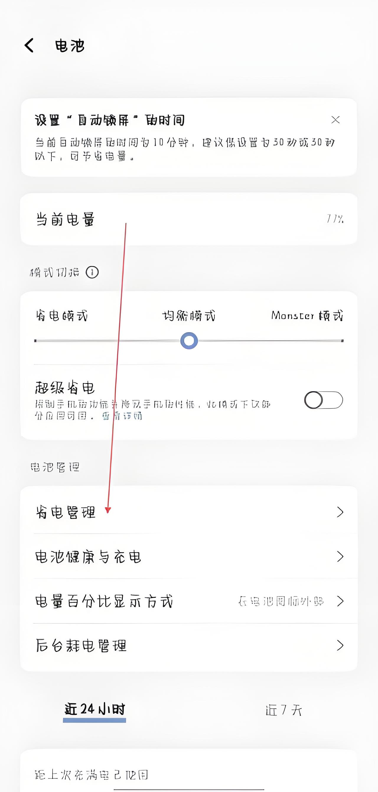 2、常用工具区域内找到电池管理 ,点击进入能看到当前电量及多种电池相关设置,下滑界面点击省电管理,就能对省电模式等进行个性化设置。