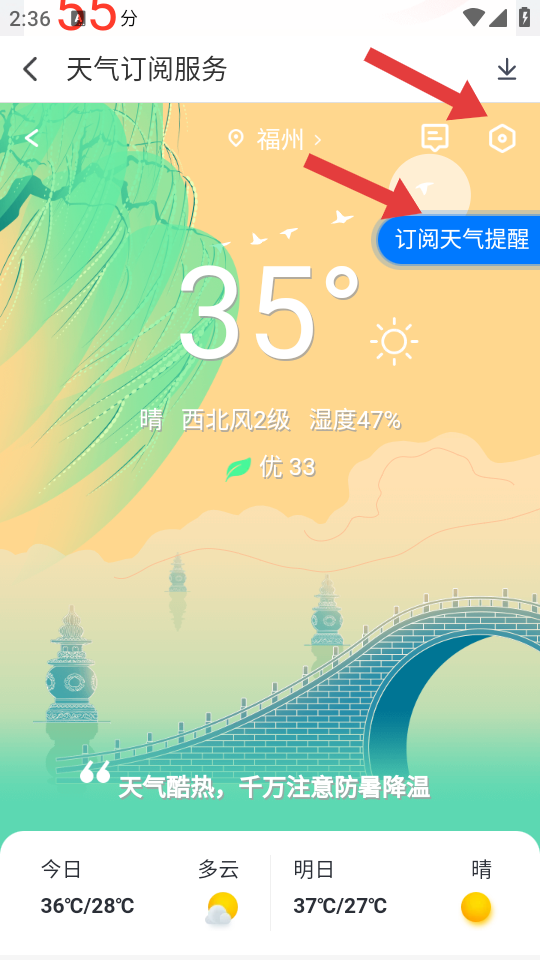 2、在天气订阅服务页面,先点击订阅天气提醒按钮,最后点击设置图标进入详细设置。