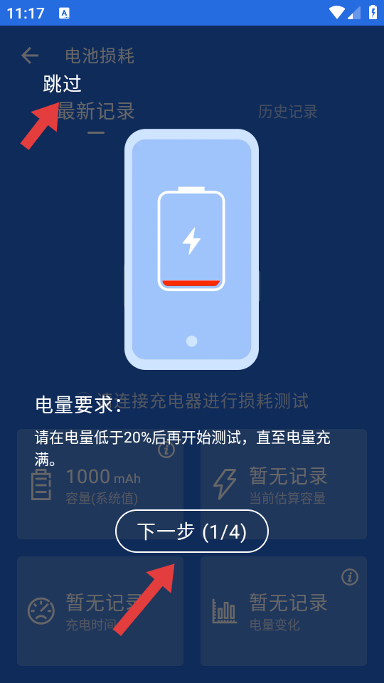 2、在电池损耗测试引导页,点击跳过或按提示点击下一步,进入电池健康度检测流程。