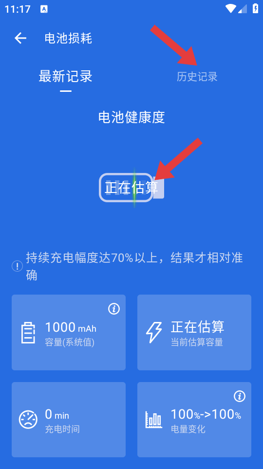 3、等待系统估算电池健康度,完成后即可查看电池健康相关数据,也可切换至历史记录页查看过往检测结果。