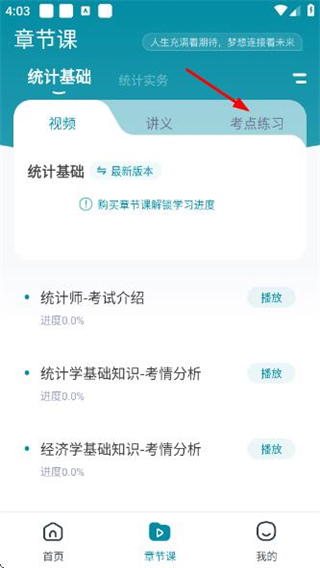 1、在统计师优题首页点击底部的章节课,进入章节课页面。
