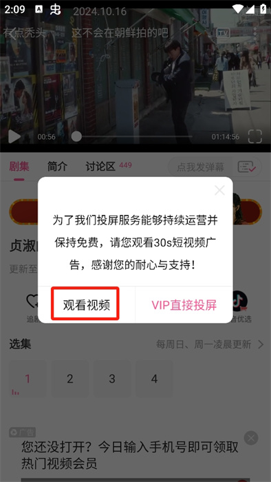 3、随后我们可以看到需要看广告才能进行投屏,每一次都需要看视频才能使用,但是三十秒也不算多,毕竟视频是不收费的。