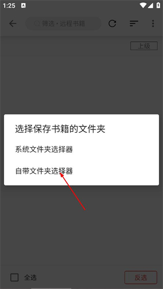 3、在选择保存书籍的文件夹弹窗中,选择自带文件夹选择器,进行文件夹选择操作。
