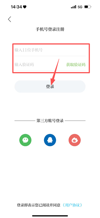3、输入手机号,填写收到的验证码后,点击登录完成账号登录。