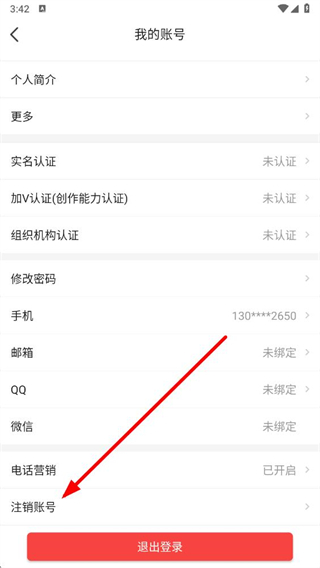 3、在我的账号页面,点击注销账号选项,进入注销账号页面。