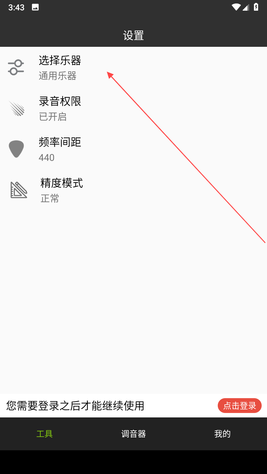 2、在工具页面中,找到设置入口并点击,进入调音器的设置界面。