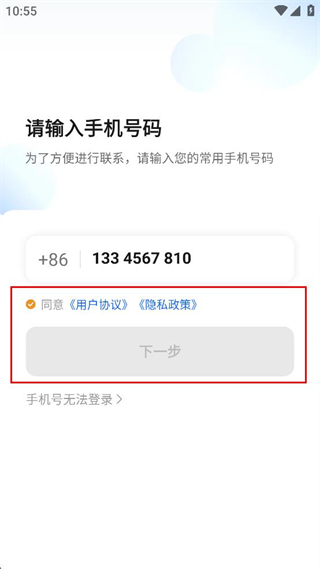 1、进入该软件的手机号输入页面,在对应输入框填写常用手机号码,准备进行后续操作。