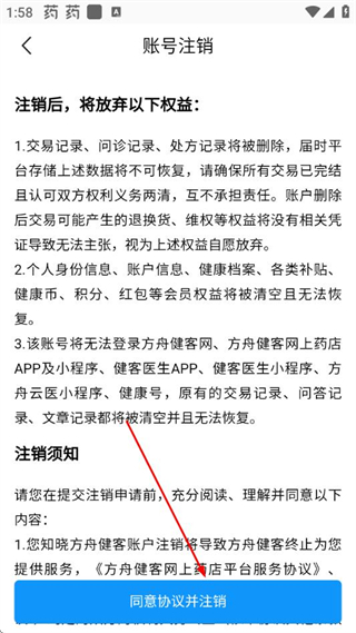 6、在注销权益说明页面阅读相关内容后,点击同意协议并注销按钮,完成账号注销操作。