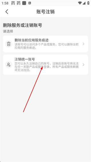 5、在账号注销选择页面点击注销统一账号选项,进入注销权益说明页面。