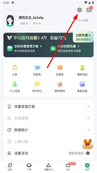 1、在薄荷健康App首页点击底部的我的,进入个人中心页面。