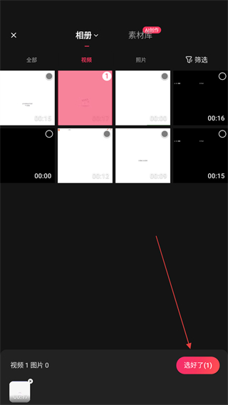 2、进入视频选择的页面内,选择后点击选好了的按钮。