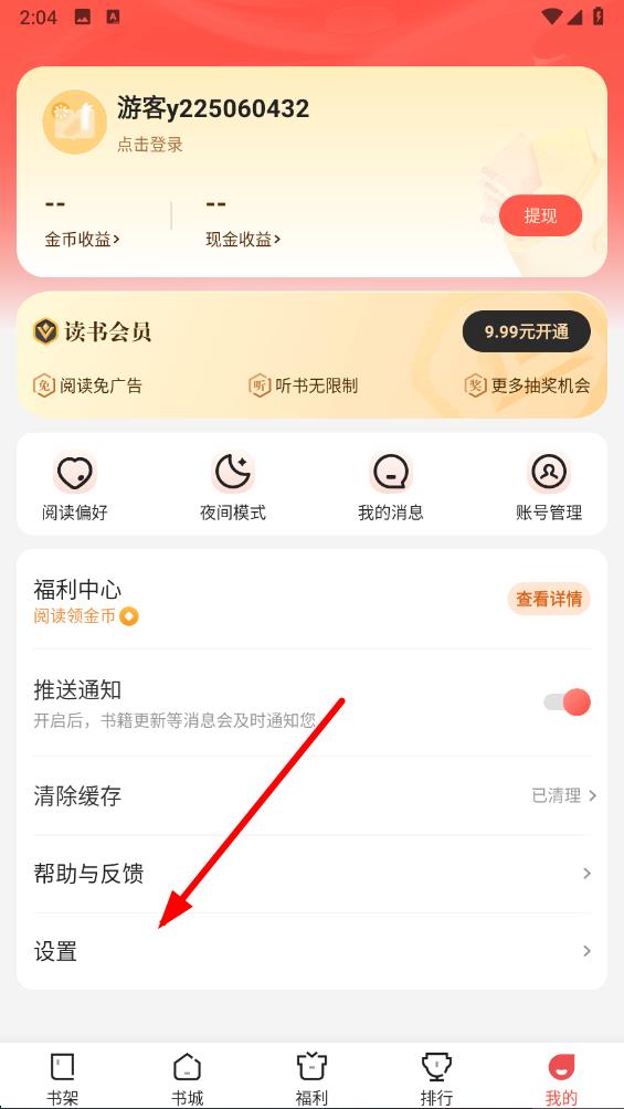 1、打开阅友小说应用进入书架界面,点击底部导航栏最右侧我的图标,进入个人相关操作页面。