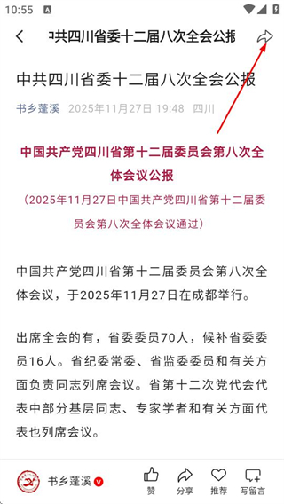 2、在资讯详情页面,点击右上角的分享按钮,弹出分享方式选择菜单。