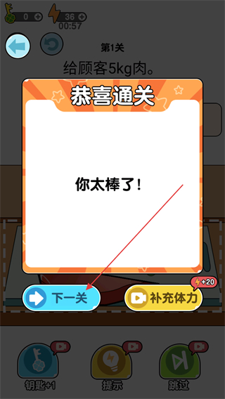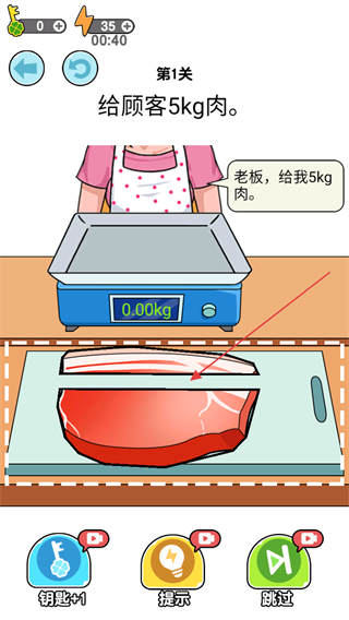 1、根据关卡要求给顾客5kg肉,在虚线范围内切割肉块。