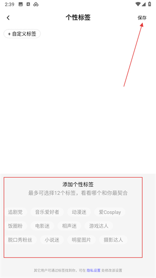 4、从下方推荐标签里选择合适的标签,选好后点击右上角保存按钮即可。