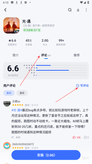 2、在应用详情页面中点击评论选项进入用户评论区,在评论区右下角点击写评论按钮,进入评论编辑界面。