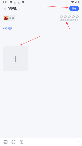 3、在写评论界面可点击+添加图片,通过滑动星星进行应用评分,接着在输入框输入评论内容,完成后点击右上角的发布按钮即可发表评论。