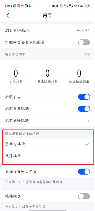 4、在网页设置页面中,找到网页视频默认播放模式板块,选择目标播放模式。