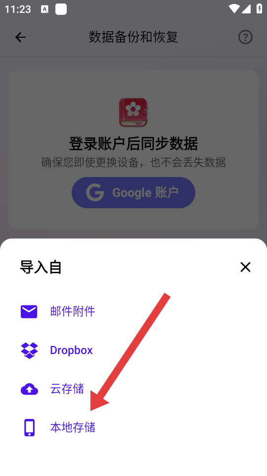 4、在导入自弹窗中,选择导入来源如本地存储,即可从对应位置导入备份数据。