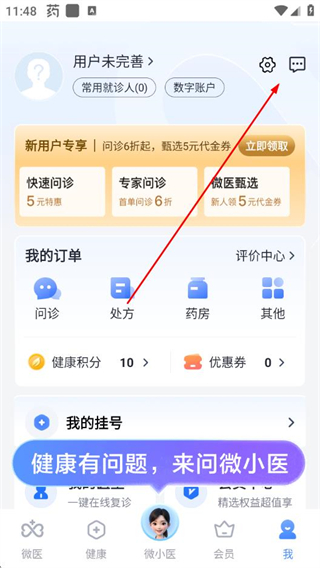 1、在微医App首页点击底部的我选项,进入个人中心页面。