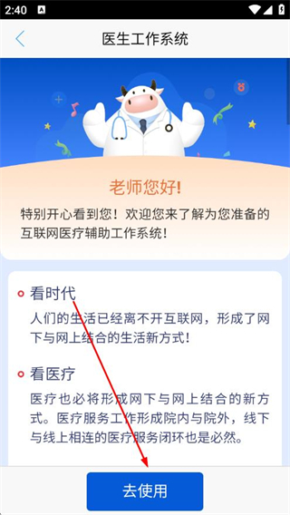2、进入医生工作系统页面后,点击去使用。