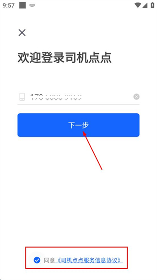 1、进入司机点点登录界面,找到手机号码输入框,在框内填写对应的手机号码,再找到协议选项并勾选。