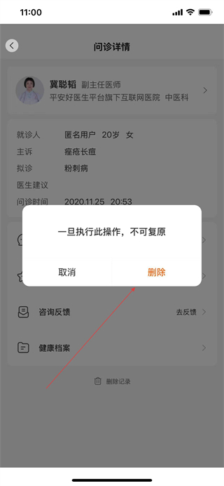 4、在问诊详情页面点击底部的删除记录,弹出操作确认弹窗。
