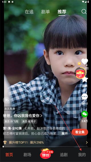 1、打开河马剧场的APP,进入推荐页点击右下角我的图标。