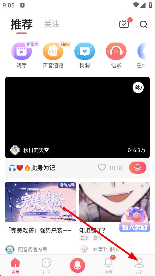 1、在配音秀首页,点击右下角我的,进入个人页面。