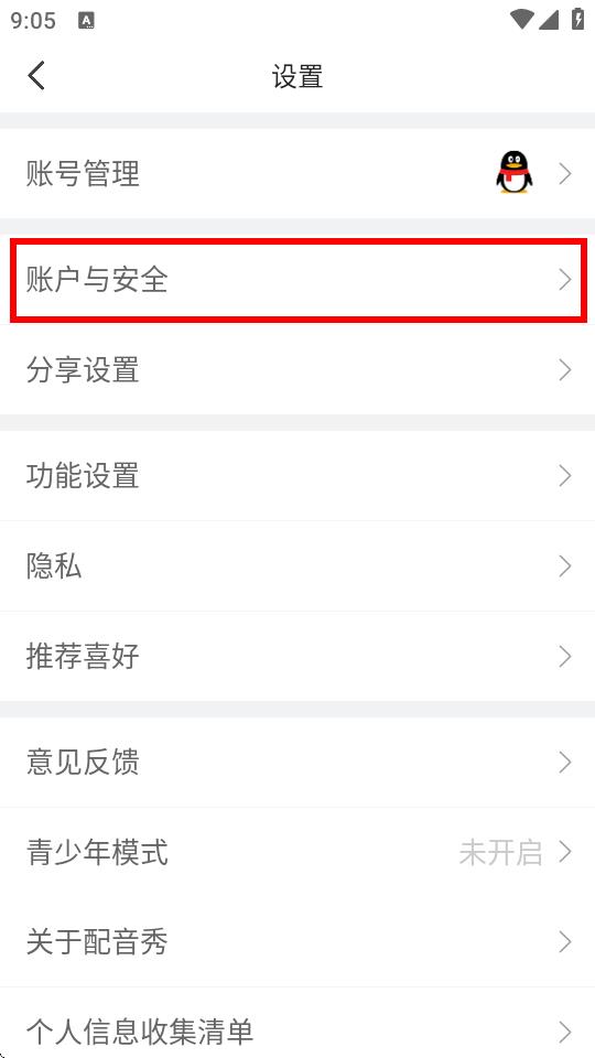 3、在设置界面,点击账户与安全选项,进入账户与安全页面。