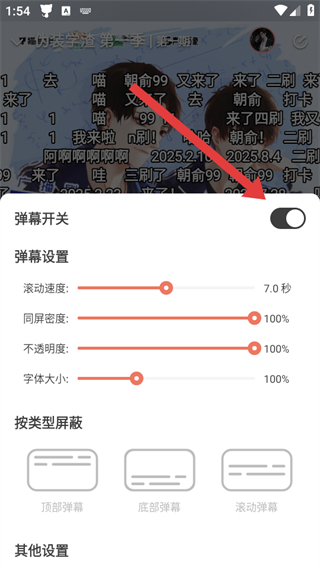 3、在弹幕设置面板中,关闭弹幕开关右侧的开关,即可关闭音频播放时的弹幕。