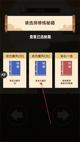 2、继续击败敌方,积累战斗进度,触发修炼秘籍选择界面。