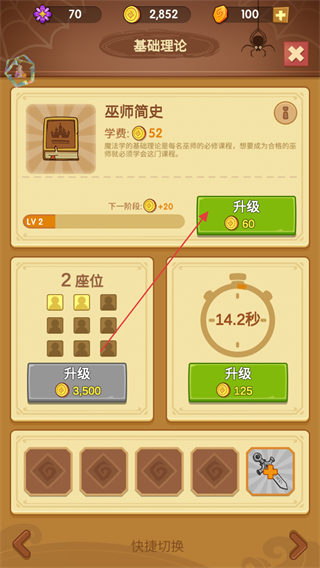 2、进入基础理论界面,点击巫师简史右侧的升级按钮,消耗金币提升课程等级。