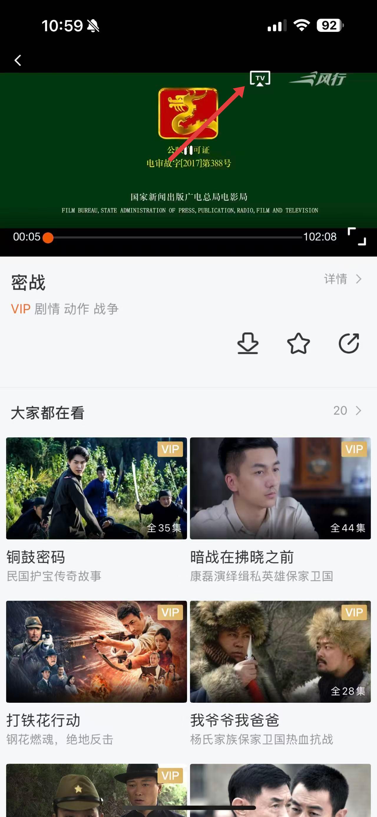1、打开风行视频APP,在首页浏览热播等栏目,选择想要投屏观看的视频,如密战。