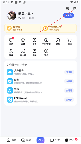 1、打开百度应用并进入我的页面,点击右上角的功能菜单按钮。